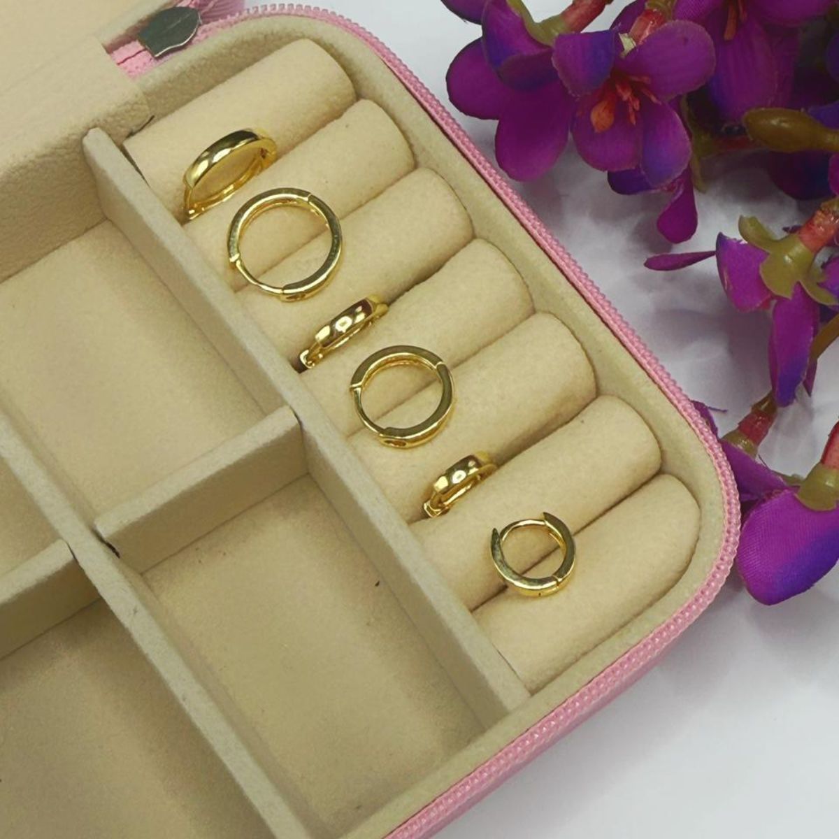Apresentamos o nosso trio de argolinhas lisas, o acessório perfeito para quem ama versatilidade sem abrir mão da qualidade. Com um design clássico e atemporal, elas são banhadas a ouro, garantindo um brilho que realça qualquer visual.
