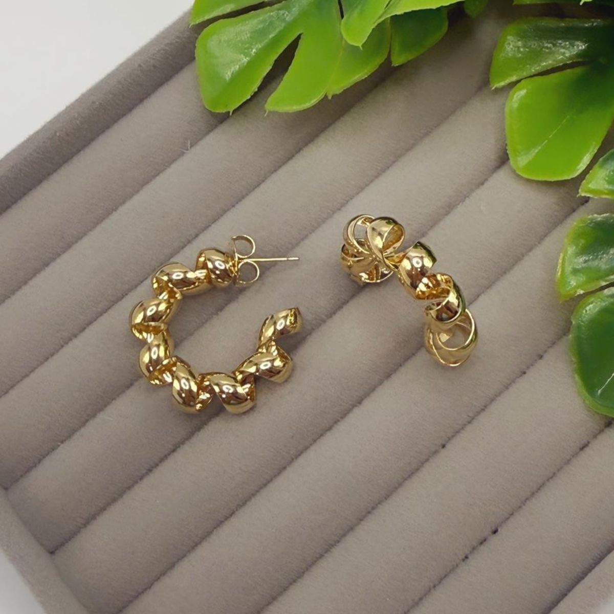 Com um design super moderno de elos ou bolinhas torcidas, ele é banhado a ouro e possui um brilho inconfundível que ilumina o rosto. O melhor de tudo? É extremamente leve, ideal para ser usado o dia todo sem incomodar, e conta com o prático fecho de tarraxa, garantindo segurança e facilidade ao vestir.