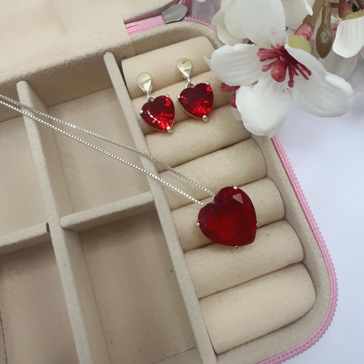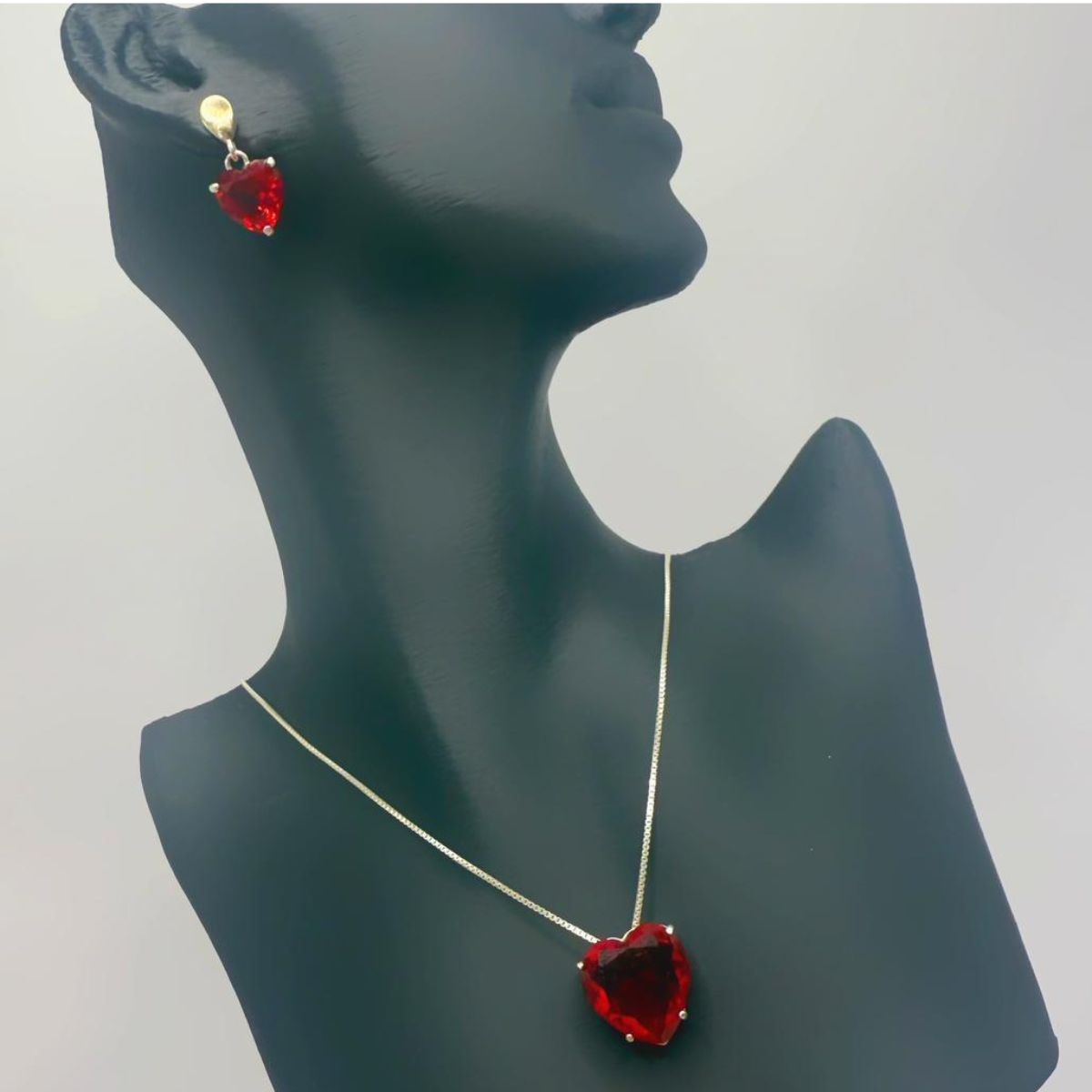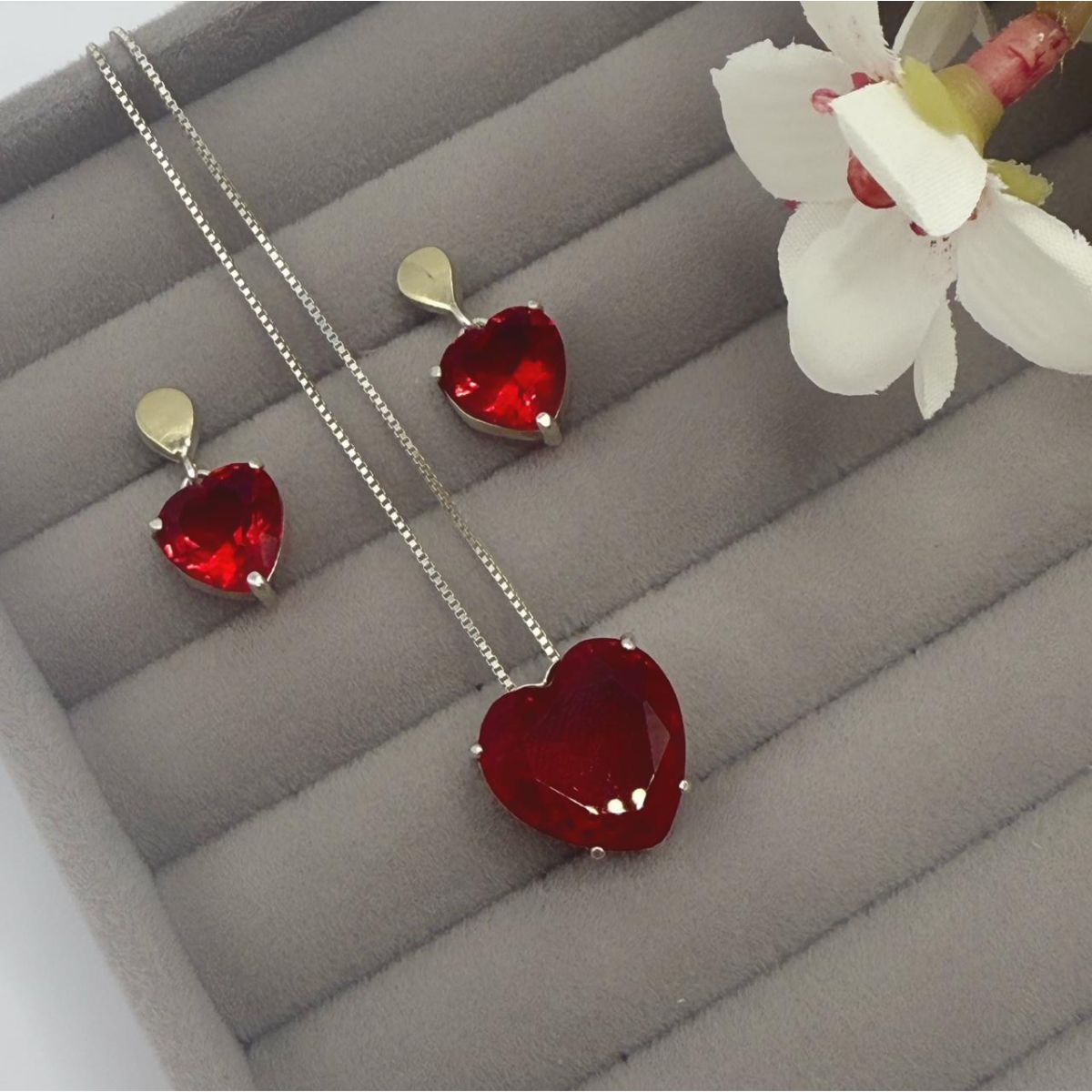 A combinação perfeita entre a delicadeza da prata e a intensidade da zircônia de rubi em formato de coração. Este conjunto é composto por um pingente deslumbrante e brincos com um charmoso aplique em ouro, que adiciona um toque de sofisticação e exclusividade.