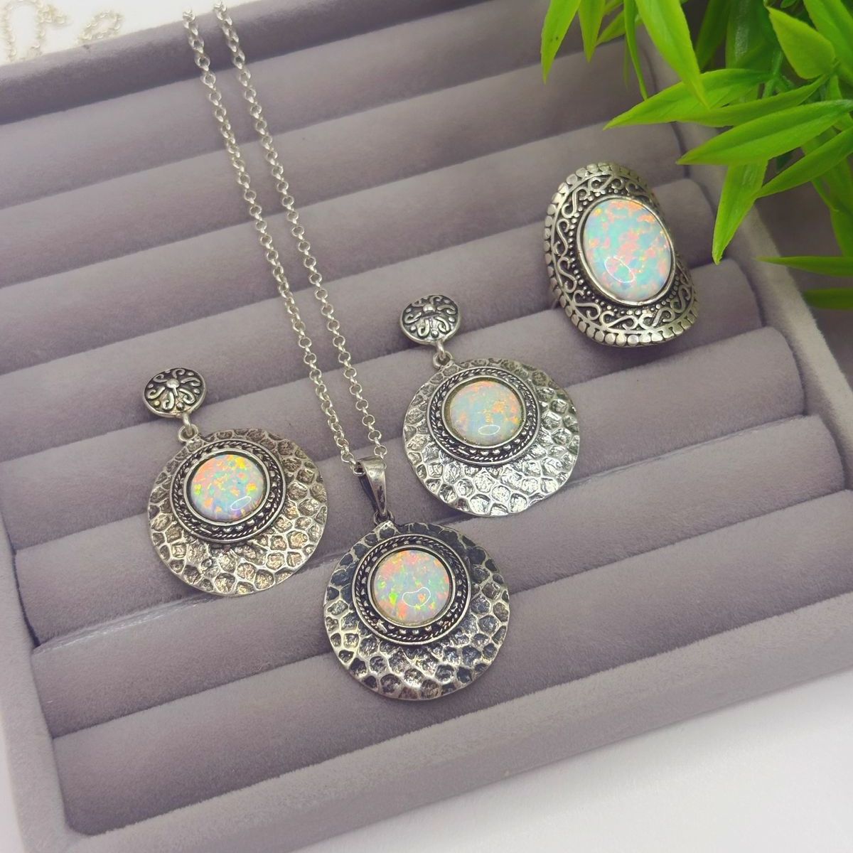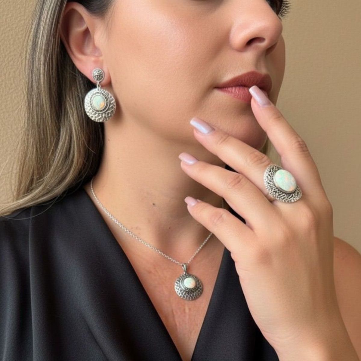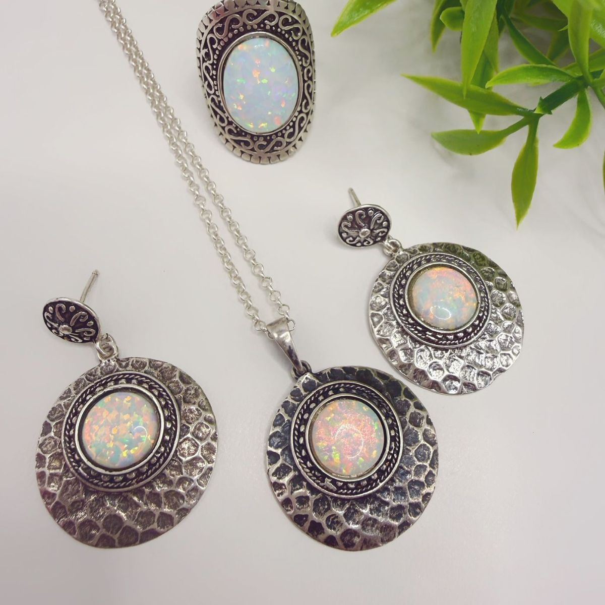 Cada peça é uma obra de arte, meticulosamente trabalhada em prata indiana autêntica, realçada por pedras naturais brancas que capturam a luz e revelam um brilho furta-cor hipnotizante. Este conjunto não é apenas uma joia, é uma declaração de estilo, um convite para abraçar a opulência e a riqueza dos detalhes.